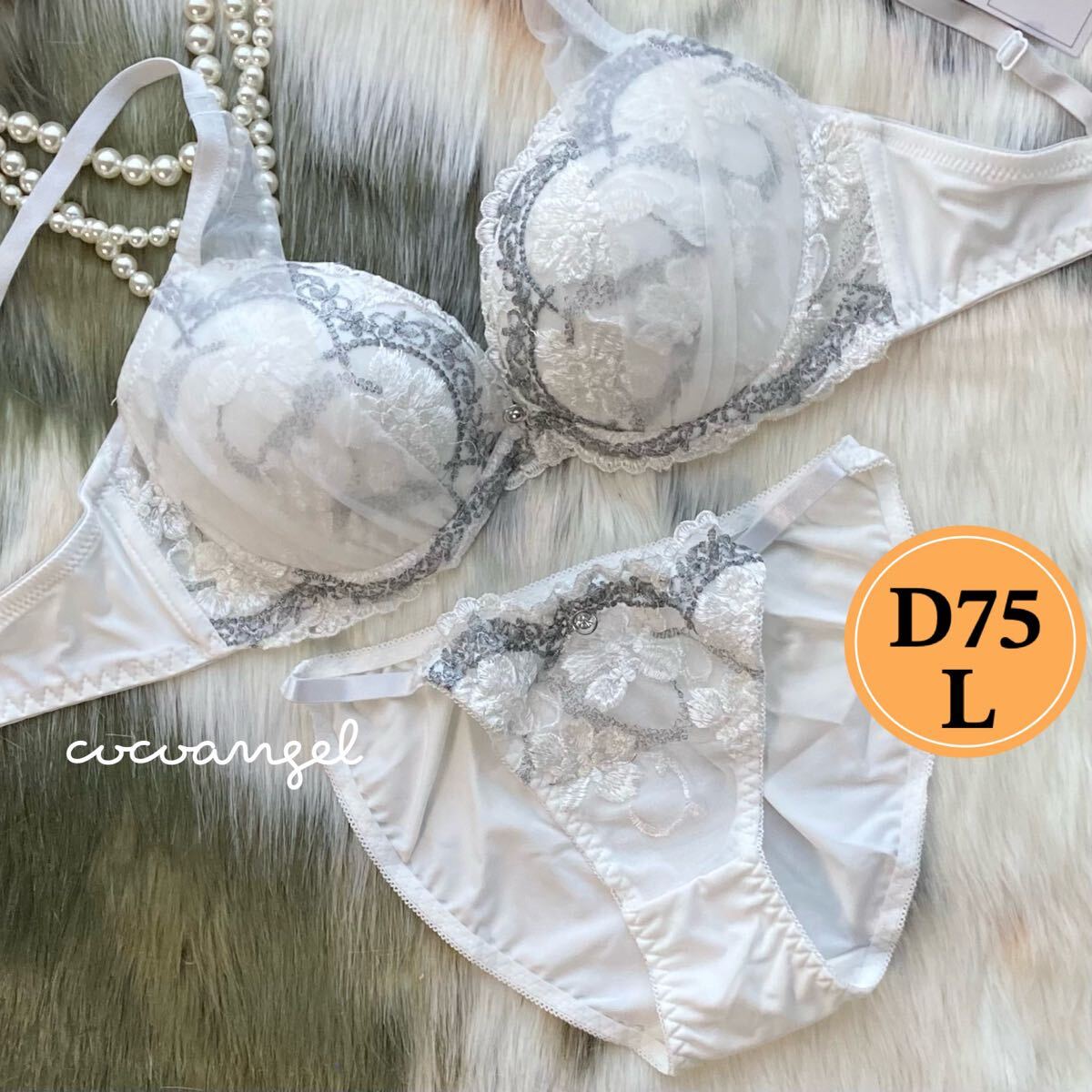 - 【D75L ホワイト 上下セット】新品 ブラ&ショーツ ブラジャーショーツ 下厚モールドカップ セクシーパンティ 花柄刺しゅう Dカップ
