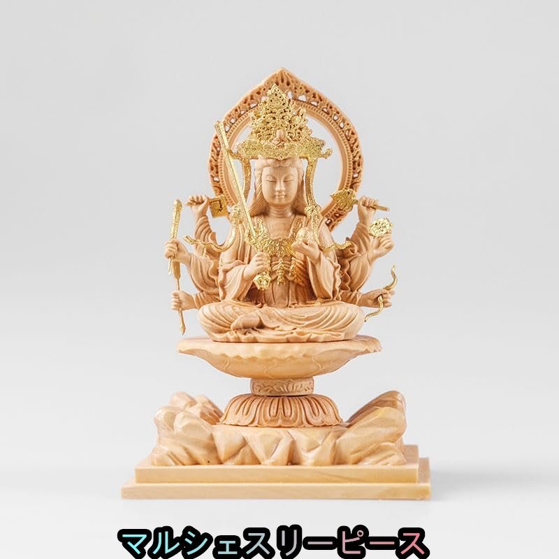 - 【掌中の仏】宇賀八臂弁財天(弁才天) 柘植 ツゲ 仏師手作 清刀彫りの仏像 音楽芸術金銭 木彫り (原木- 金泥仕様)