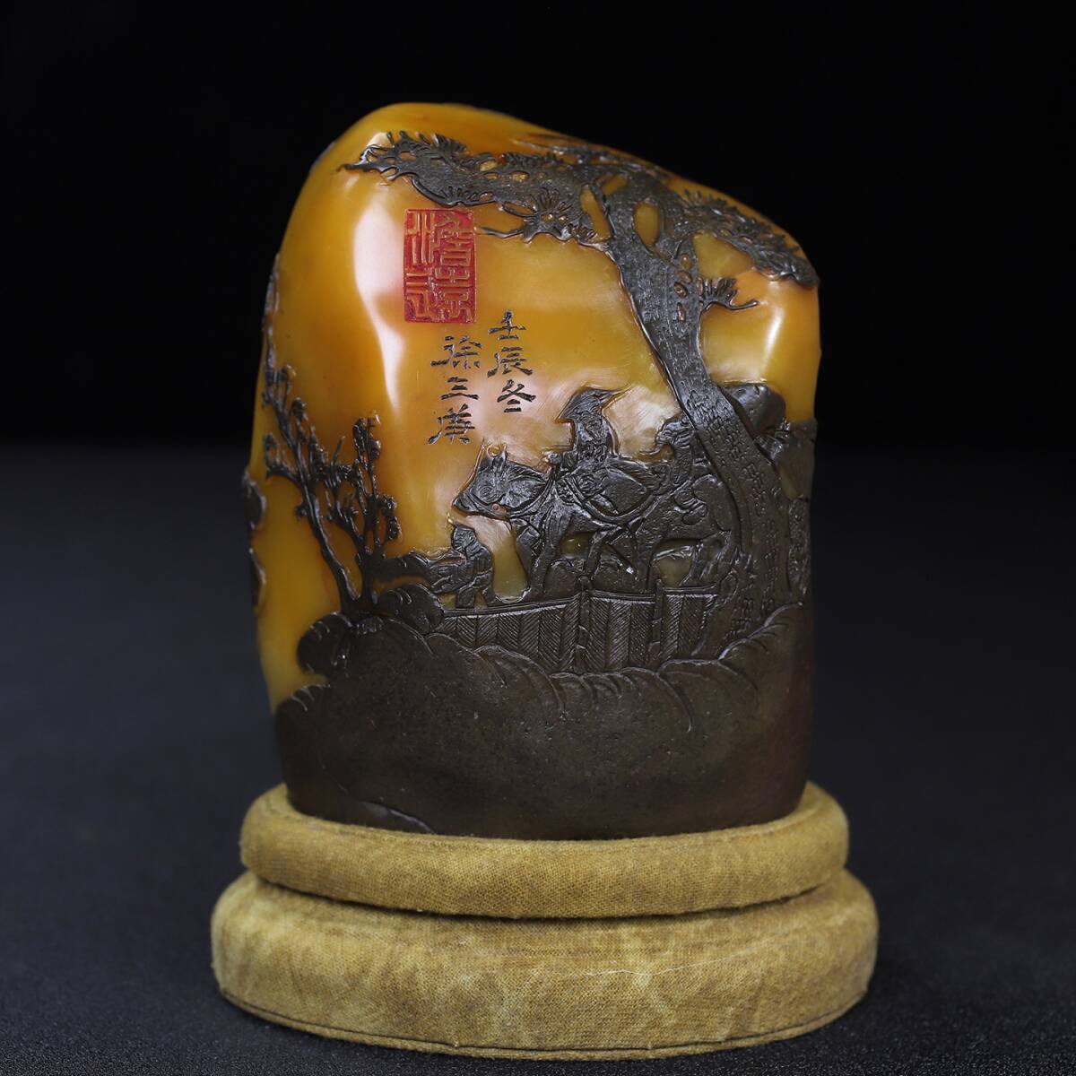 - 【超珍館蔵】寿山石 烏鴉皮 田黄石 細密彫 人物故事紋印章 箱付 置物 古賞物 古美術品 稀少珍蔵品