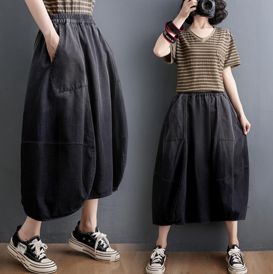 - 人気推薦/レディース デニムスカート ウエストゴム ポケット デニムロングスカート 体型カバー 無地 ゆったり ロングスカート/ブラック