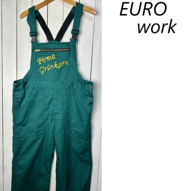 > ユーロワーク 90s~ ハンド刺繍入り オーバーオール 52 緑 オールド ヴィンテージ ヨーロッパ古着 EURO古着 XL~2XL ポリコットン ●94