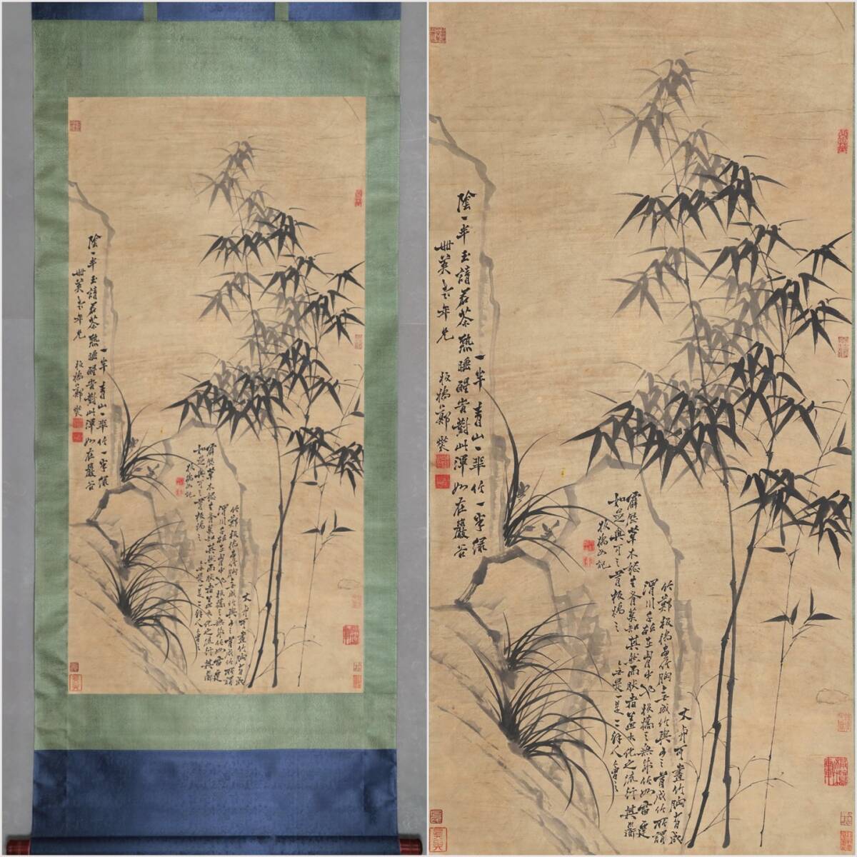 - 古美術 掛け軸 中国・清時代 「鄭板橋書」 紙本 【竹石蘭草図】 立軸 書道 巻き物 肉筆保証 唐物 古画 画心137x68cm LT-250393