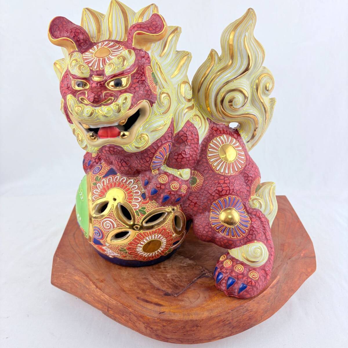 - 【送料込み】九谷焼 狛犬(獅子) 置物(台座付き)昭和 レトロ 九谷焼き 玉乗り獅子 狛犬 #6762
