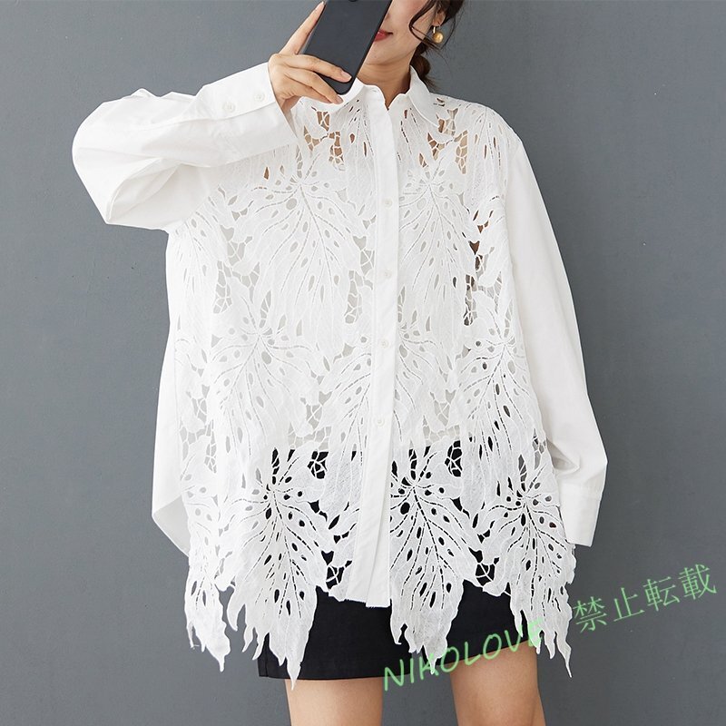 - ☆新品 ゆったり大きいサイズ レディース レース切り替え 長袖シャツブラウス トップスチュニック F 白 MK442