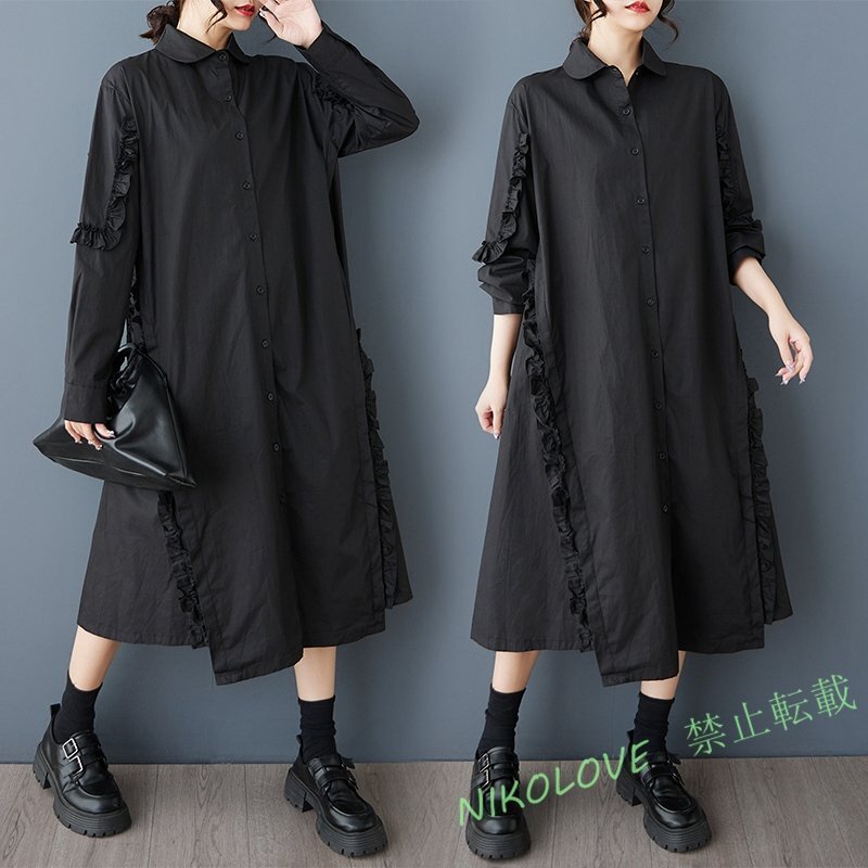 - ☆新品 ゆったり大きいサイズ レディース 着やせ 可愛いフリル長袖シャツロングワンピース F MK456