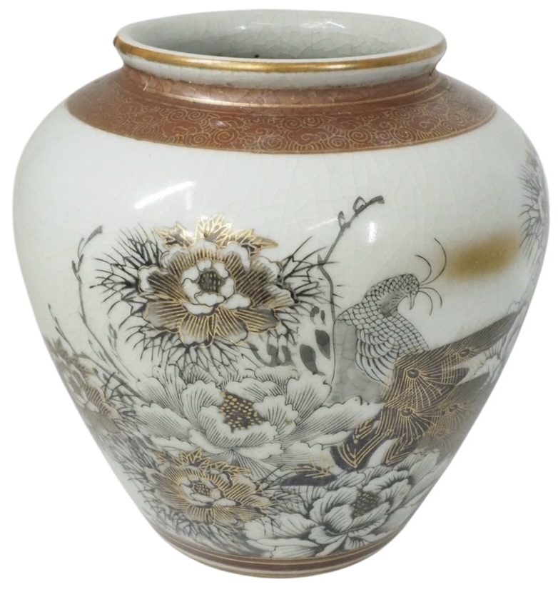 - 美しい金彩が施された花鳥紋様の壺! 昭和ビンテージ 九谷焼 龍山作 金縁金彩花鳥紋壺 在銘品 箱無 1970年代 MMK703