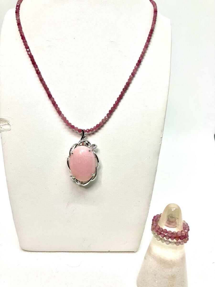 > 【新品】天然ピンクオパールネックレス・サファイアリングセット*10月の誕生石*リーフデザイン*上品*希少*形状記憶*二点セット