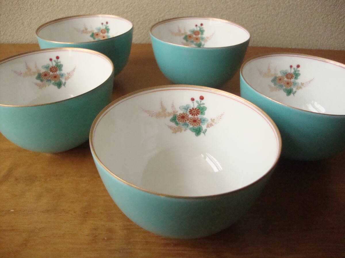 - 未使用 香蘭社 金彩 小菊 南天 湯呑 5客セット 青緑 ターコイズ ブルー 湯のみ 茶碗 有田焼 磁器