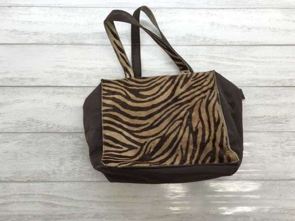 - サザビー SAZABY レトロモード アニマル柄 虎柄 ハラコ 切替 ハンドバッグ サイドファスナーポケット レディース 茶色
