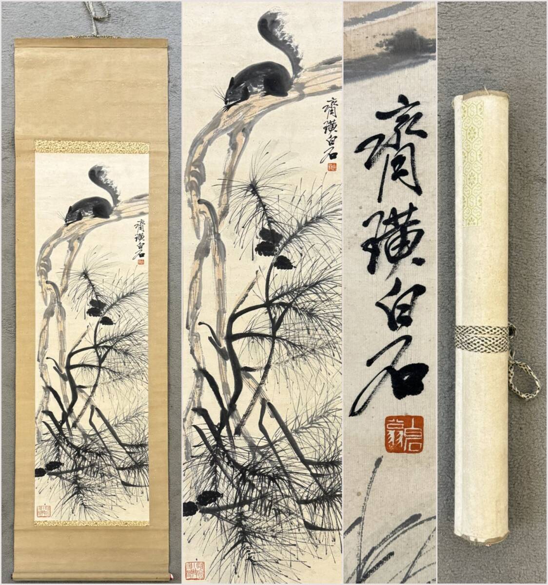 - 古美術 掛け軸 中国・近現代 「斉白石書」 紙本 【リス図】 立軸 書道 巻き物 肉筆保証 唐物 古画 画心131.5x33cm LT-2503183