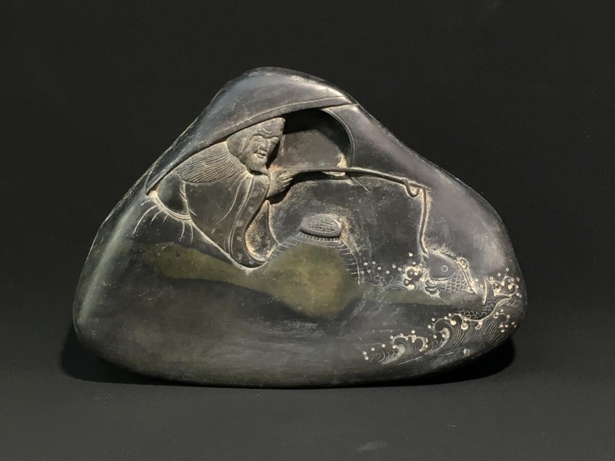 - 清代 端石浮彫 漁翁得利文房端渓硯 彜齋銘【仁】手彫り 文房具 書道具 中国古硯 蔵出 骨董