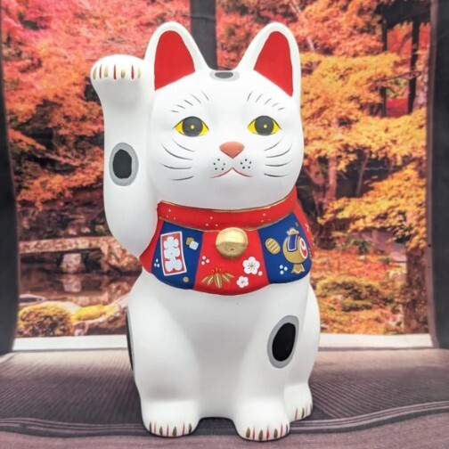 - 招き猫 縁起物 福づくし招き猫 右手上げ 白 大 置物 薬師窯
