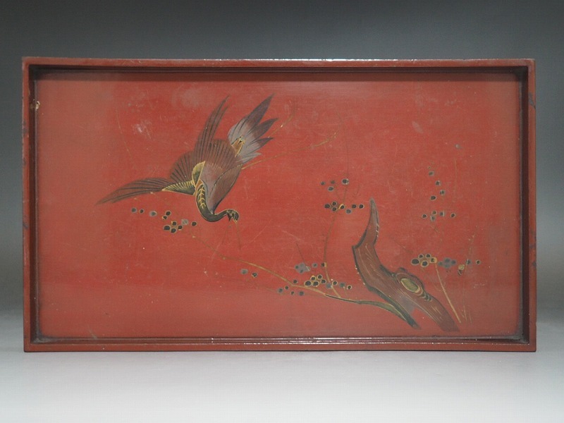- B1612 朱塗 鶴梅蒔絵 長方盆 時代物 ☆ 旧家蔵出 古い 古玩 骨董 古美術 美術品 茶道具 茶器 茶懐石 茶事 茶盆 角盆 運び盆 切手盆 祝儀盆