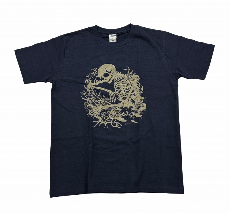 > [江戸てん] L 一点物 Tシャツ スラブ生地 6.8オンス 抜染 和柄 花髑髏(前面) 紺
