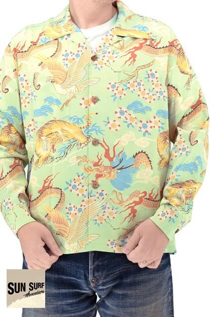 - 長袖アロハシャツ「THE TRIANGULAR FIGHT」◆SUN SURF グリーンXXLサイズ SS29404 サンサーフ 虎 トラ 和柄 日本製 ハワイアン