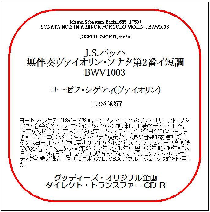 - J.S.バッハ:無伴奏ヴァイオリン・ソナタ第2番/ヨーゼフ・シゲティ/送料無料/ダイレクト・トランスファー CD-R