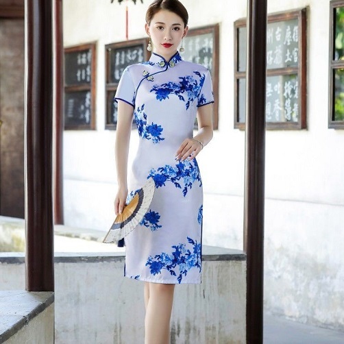 - チャイナドレス ひざ丈(ホワイト×ブルー)パーティー 発表会 衣装 コスプレ キャバ ミニ チャイナドレス 新品