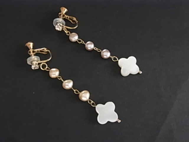- ♪クリアラインストーンが1粒輝く 微かにピンクがかったお花のシェル調デザインに薄紅色系とフレッシュピンク系のストーン付きイヤリング