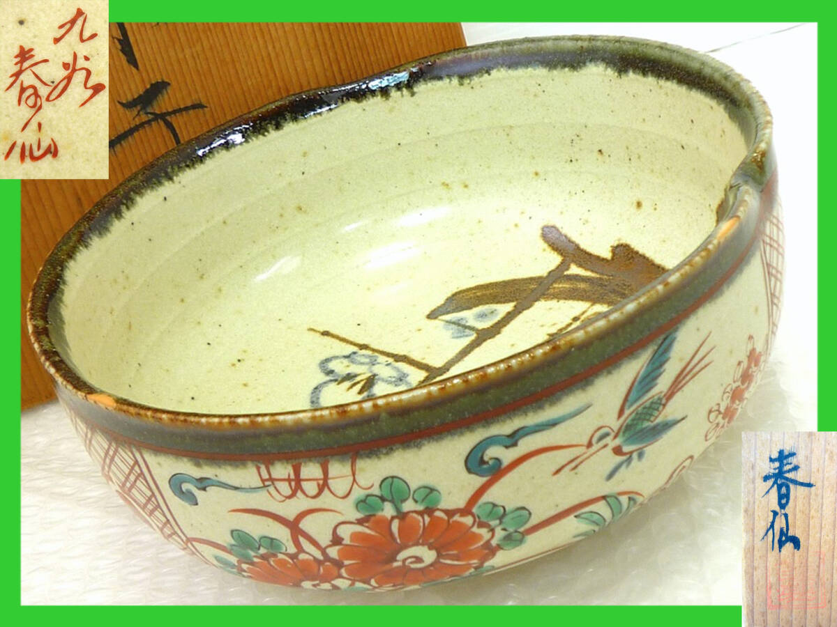 > 未使用 九谷焼 春仙 花鳥 お菓子鉢 共箱 深鉢 お鉢 お皿 深皿 桐箱 銘有 茶道具 趣 逸品 在銘 骨董 座敷 和室 古風 希少 貴重 レア 必見②