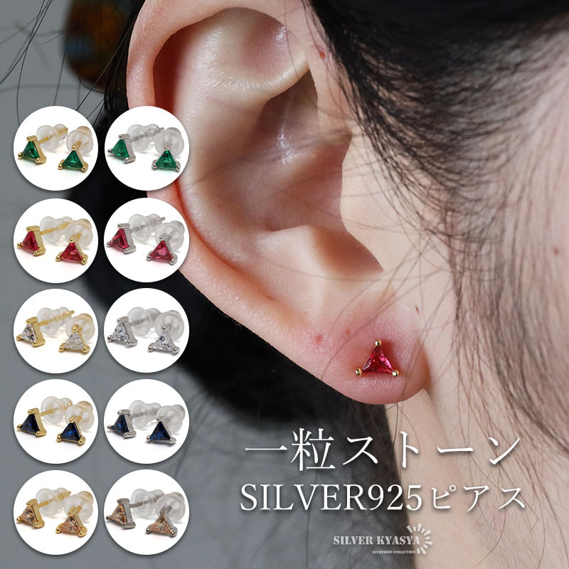 - (シルバー、オレンジ) シルバー925 トライアングルピアス 一粒ピアス ストーンピアス 両耳2点 女性 金アレ対応