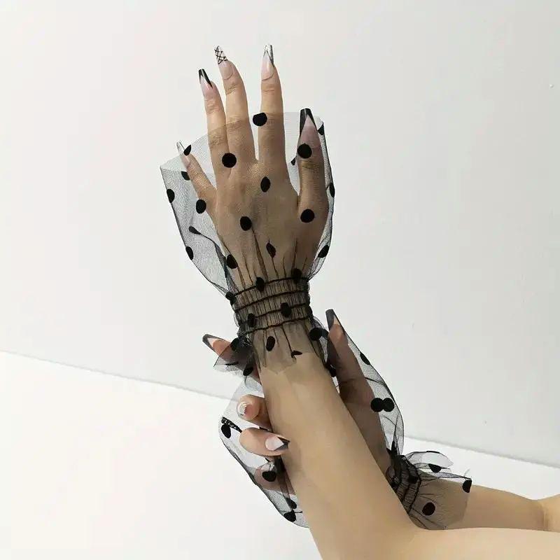 - ラスト1点 つけ袖 黒 ドット シアー フリル チュール 2枚袖 おしゃれ 韓国