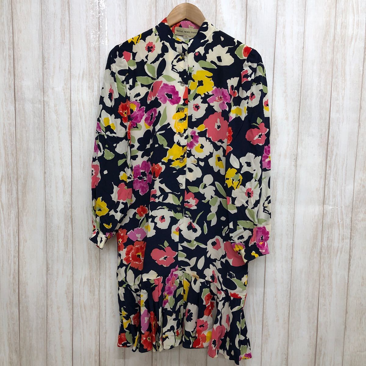 > HANAE MORI PARIS ハナエモリ 花柄ワンピース サイズ11A3 シルク スタンドカラー レディース YF193