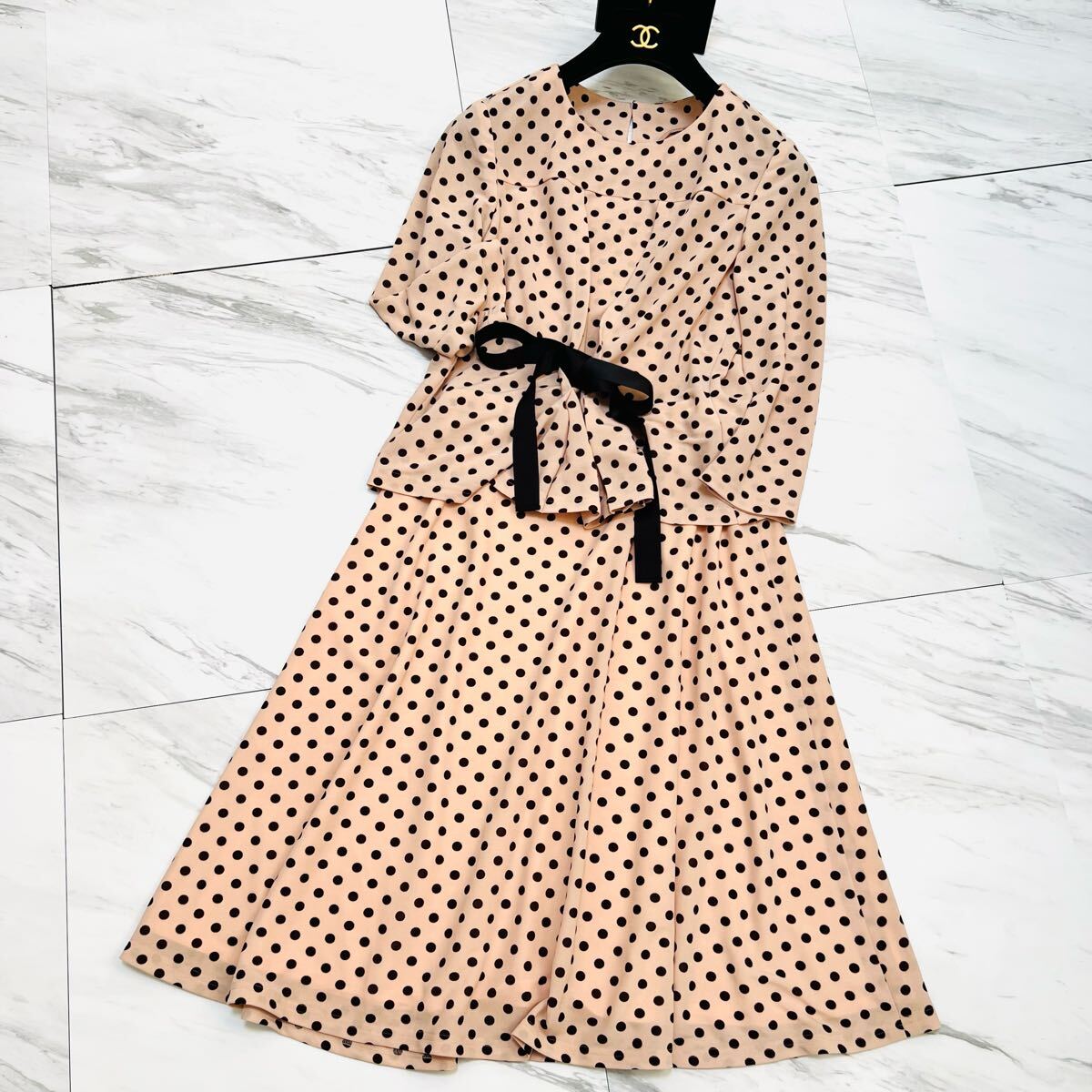 > 極美品 Lサイズ レリアン プラスハウス【セットアップ ドット リボン 大きいサイズ 11】Leilian カットソー フレアスカート ワンピース