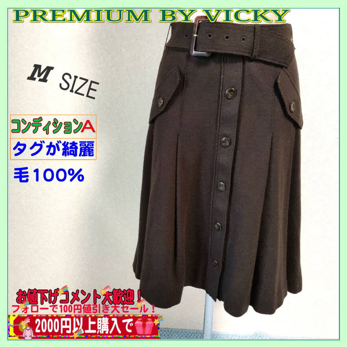 > 美品 プレミアムバイビッキー レディース フレアスカート ベルト付 毛(ウール100%)送料無料 匿名配送 ベルト付 ブラウン色