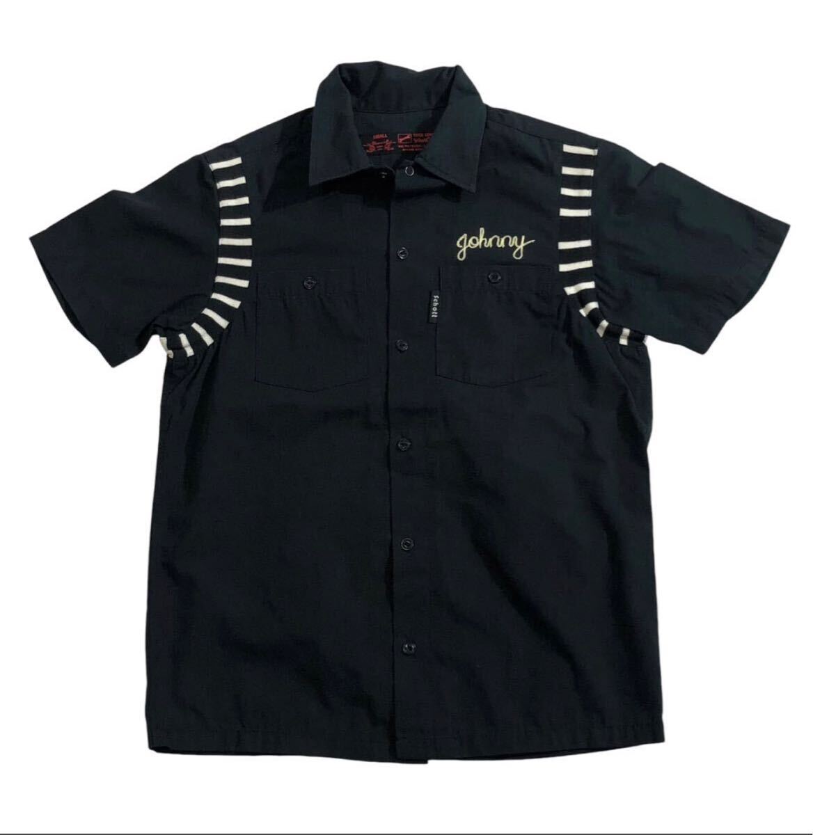 - 送料無料 ■ Schott ショット ■ ロゴタブ チェーンステッチ 刺繍 半袖 ボーリングシャツ ブラック S
