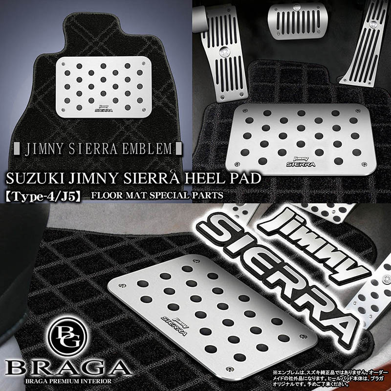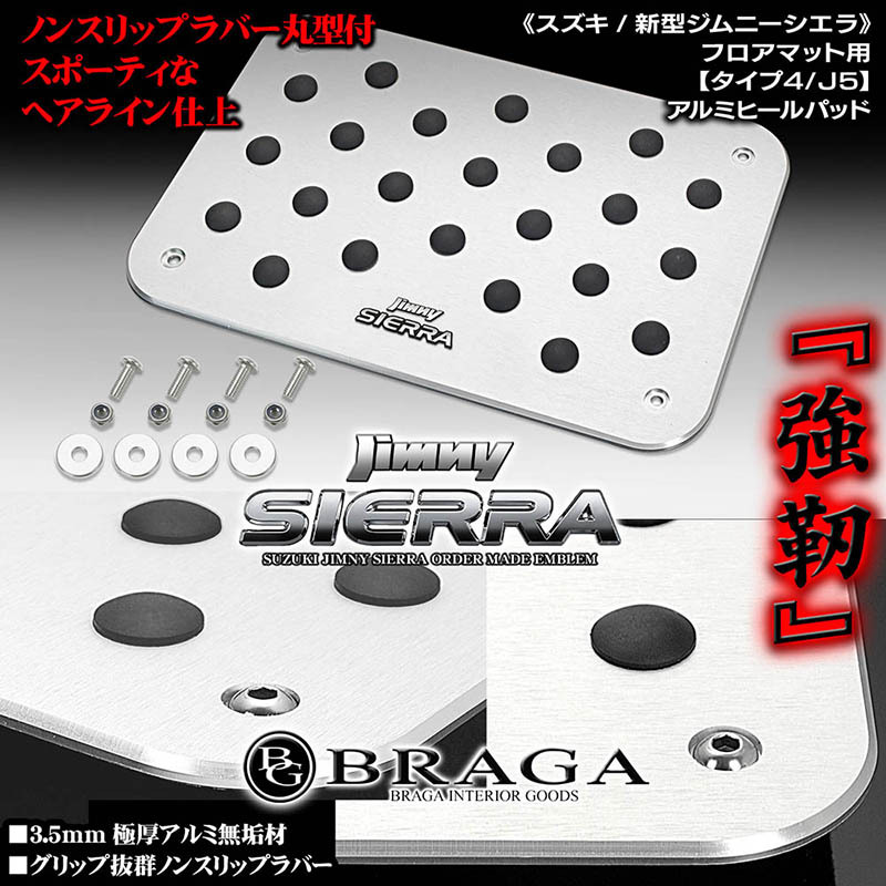 > スズキ/新型ジムニー シエラ エンブレム付/ヒールパッド プレートセット【タイプ4/J5】アルミ製フロアマット用/滑り止めラバー付/ブラガ