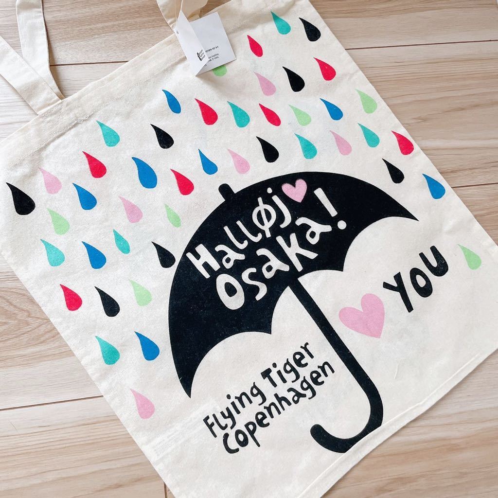 - 新品 flying tigerエコバッグ大阪限定 フライングタイガー ショップ袋ショッパー雨トートバッグ傘ピンク グリーン緑イエロー黄色ブルー青