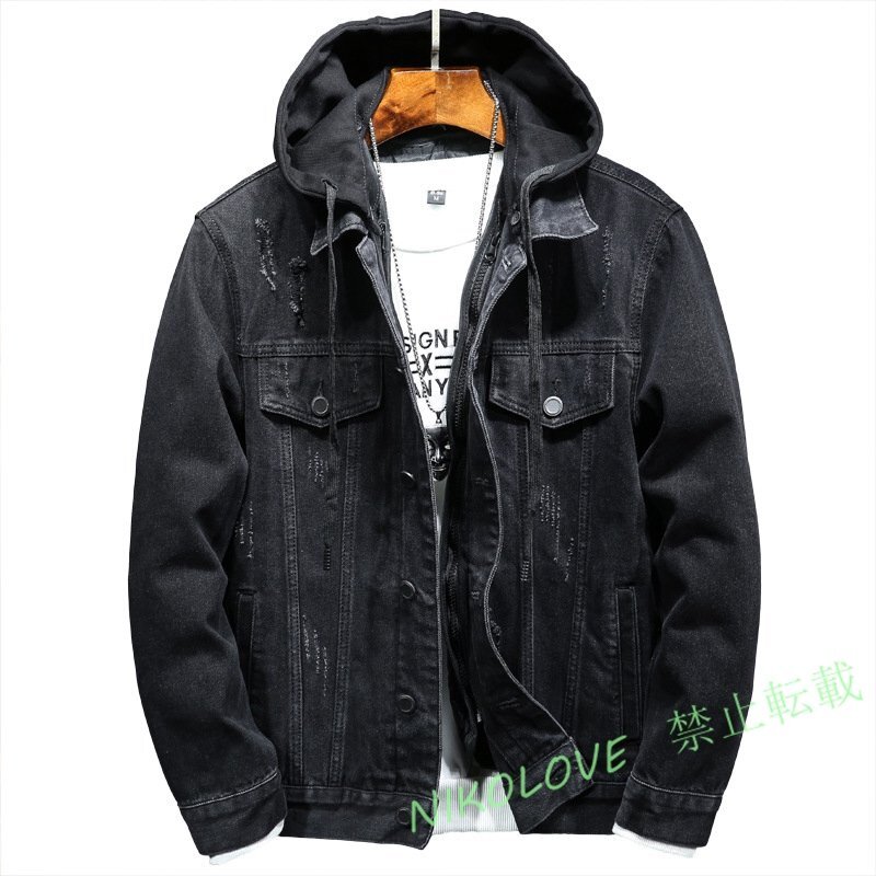 - 新品 冬 デニムジャケット ジージャン フード 取り外し可 アウター 中綿 ジャンパー ブルゾン ショートコート Gジャン黒 XL