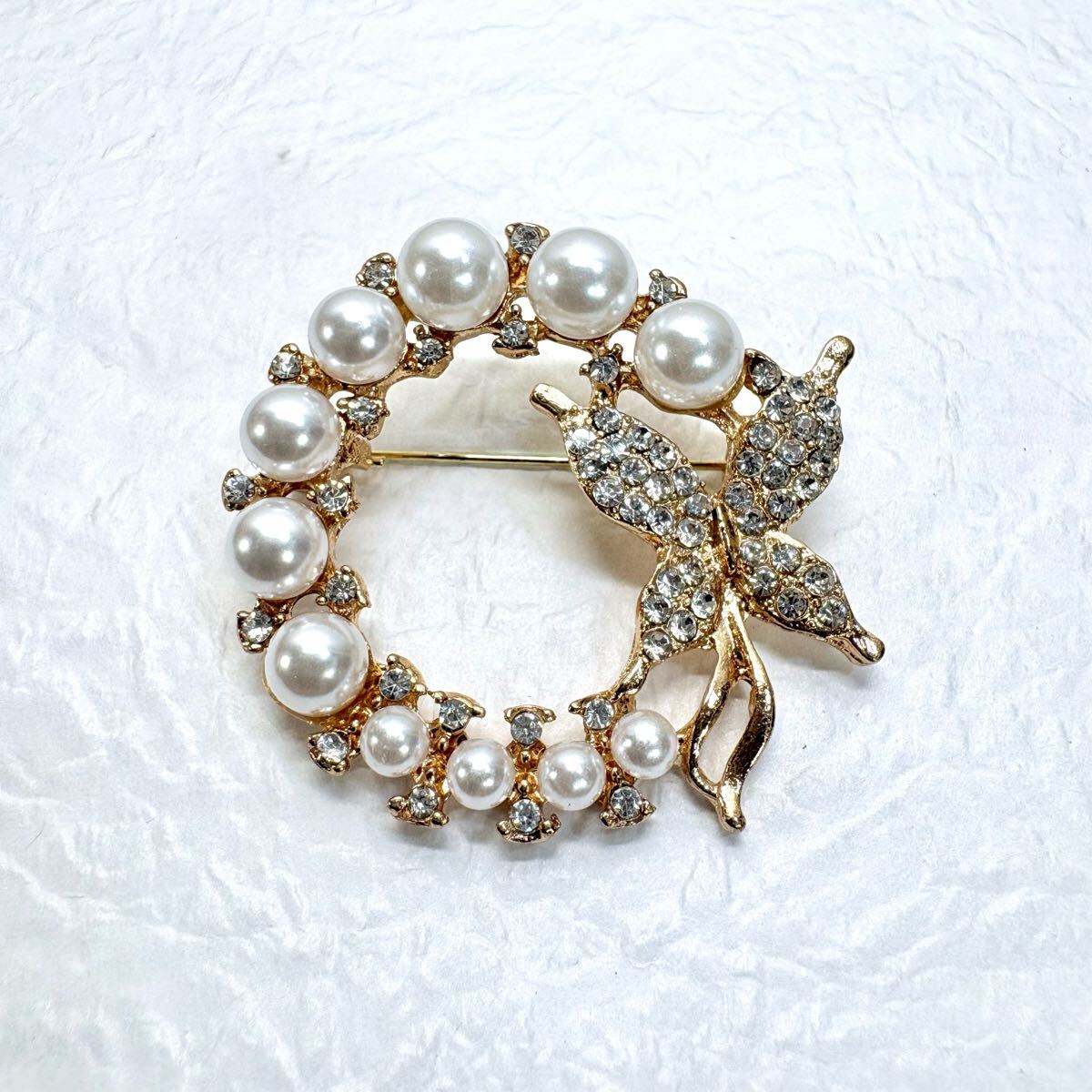 - 【ブローチ】パールと蝶々 ラインストーン リース ゴールド 01-1