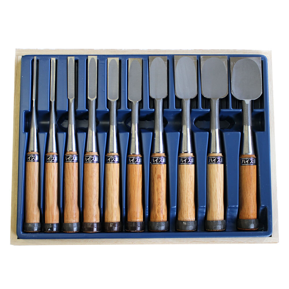 - 播州三木 ハイス鋼 赤樫柄 追入鑿 10本組 木箱入 集成材デコラ 鑿 セット