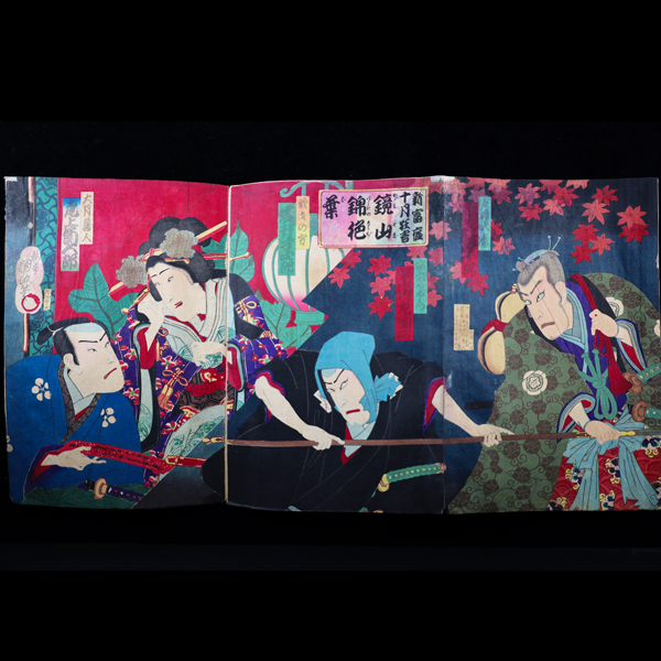 - ◇雅◇ 真作 国政 「新富座十月狂言 鏡山もみじ葉」 錦絵 芝居絵 歌舞伎絵 武者絵 役者絵 浮世絵 木版画 3枚続 大判 /FT.25.3[H120.41]QPO