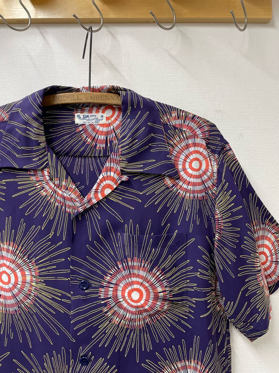 - sizeM 未使用 東洋 サンサーフ レプリカ ビンテージ ハワイアンシャツ アロハシャツ レーヨンシャツ 紫 開襟 日本製 花火 サンフラワー