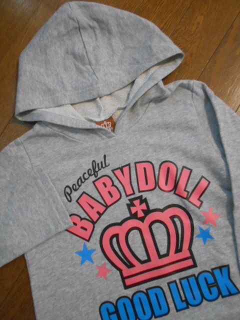 - BABY DOLL・ベビードール☆キッズ140cm☆コットン100%x両面ビッグロゴ♪杢グレー裏毛フード付ワンピース/パーカーワンピース 未使用品