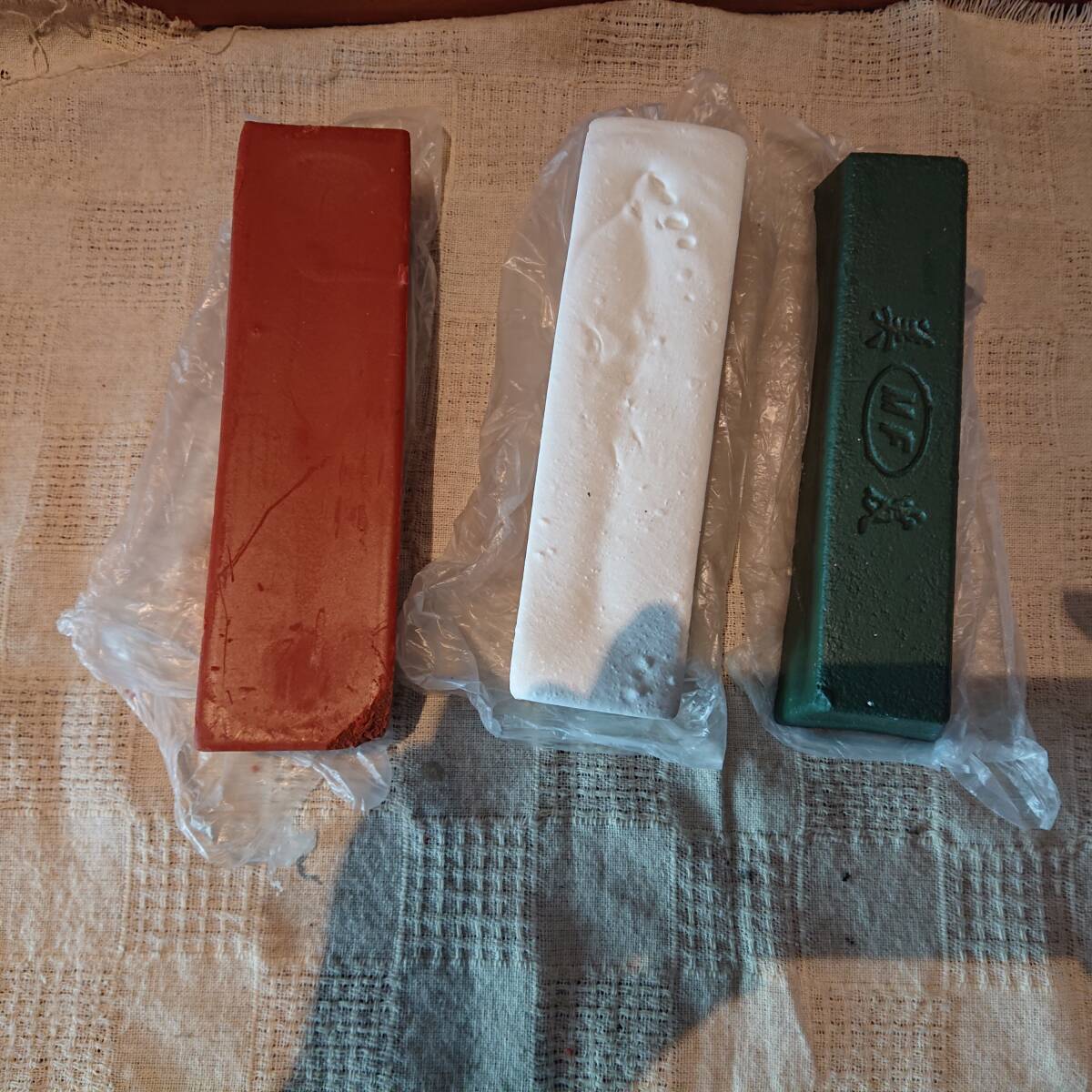 - まとめて 赤棒・白棒・青棒 バフ掛け研磨剤3本セット 粗磨き 中仕上げ 最終鏡面仕上げ 1本約550g