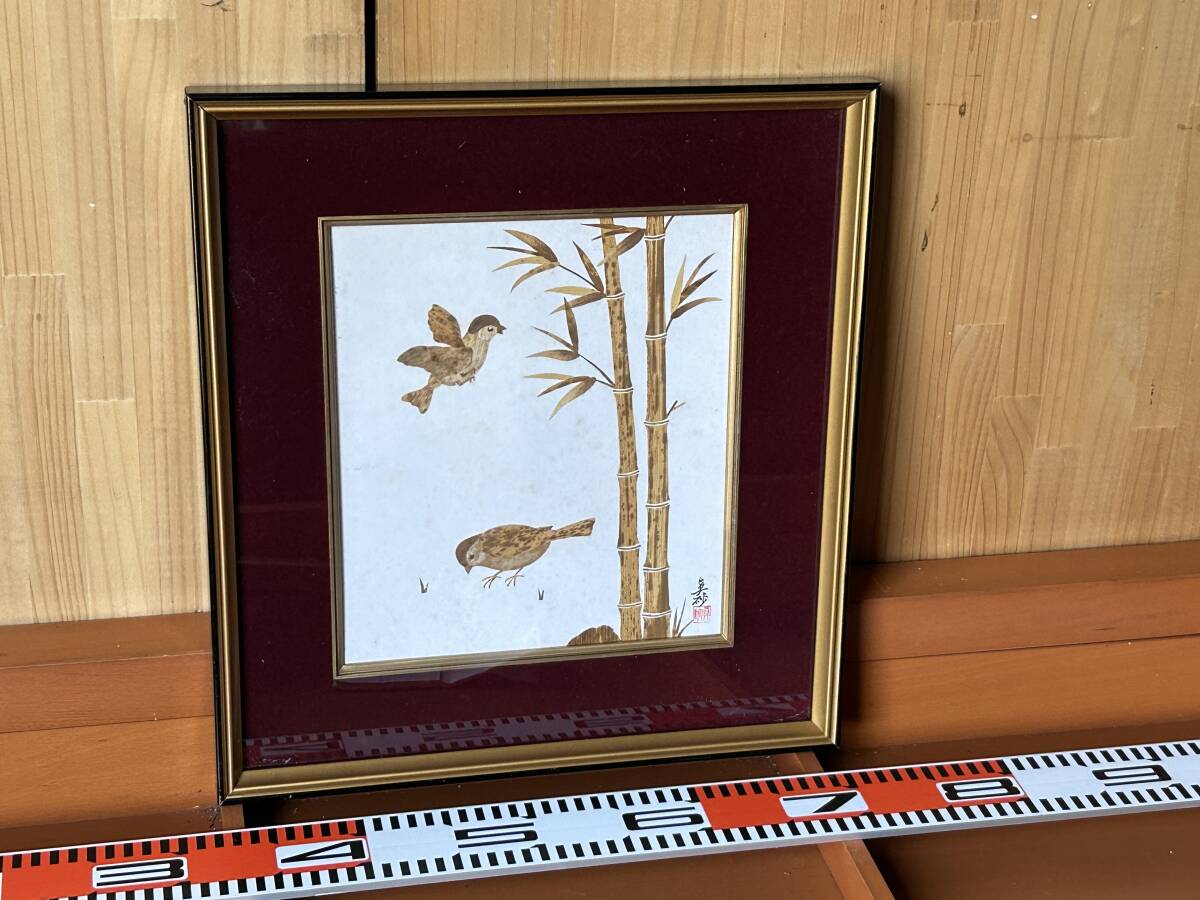 - 【中古額縁 竹の皮カッティング?竹林・スズメ】