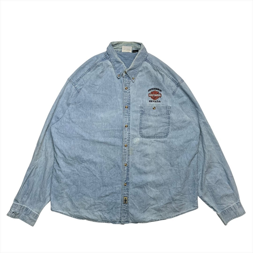 - 【訳アリ】 BLUE POINTE ハーレーダビッドソン ボタンダウン デニム シャツ 長袖 ブルー Harley-Davidson 古着 メンズ XXL ヴィンテージ