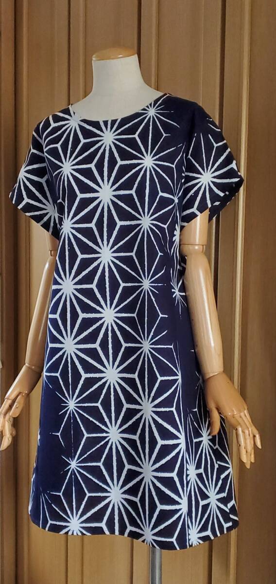 - 紺白 変わり麻の葉模様 着物リメイク 浴衣 反物 チュニック 綿100% ハンドメイド コットン