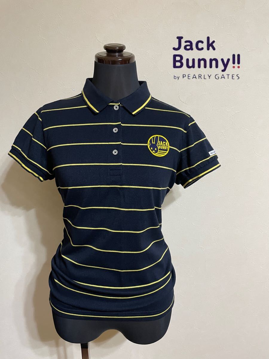 - 【美品】Jack Bunny!! by PEARLY GATES ジャックバニー パーリーゲイツ ゴルフ レディース ボーダー ドライポロシャツ サイズ1 半袖 紺 黄