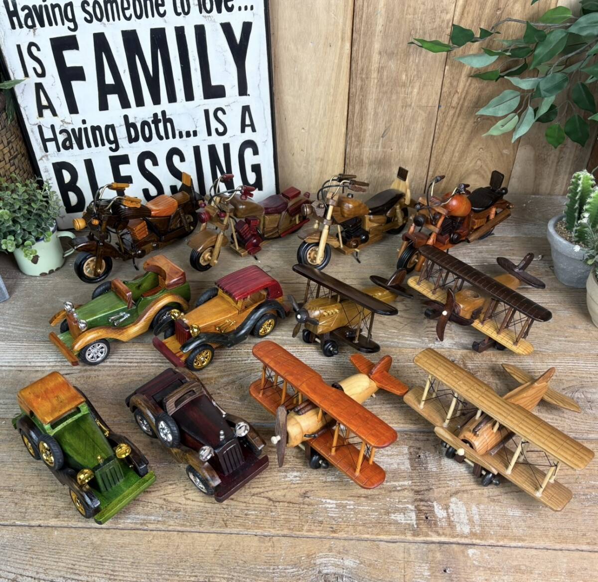 - レトロ木製インテリア雑貨乗り物12点セットウッドクラシックカーバイクセスナ機大量おまとめセットフィギュアミニチュア