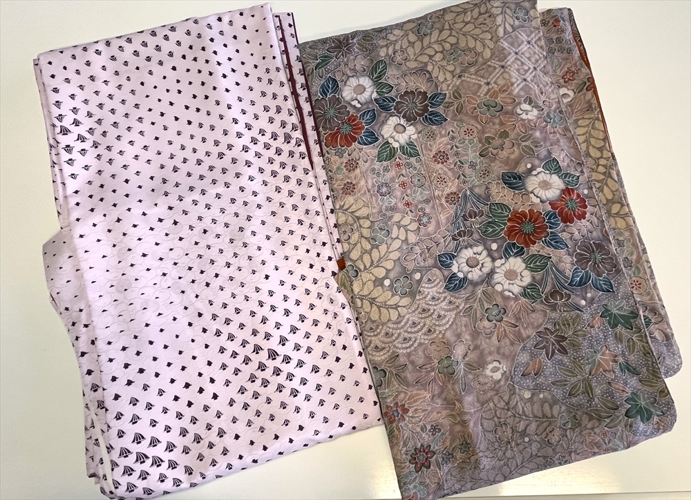 - 花とら●リサイクル着物 小紋 2枚まとめて 絹 灰紫 辻が花風 ポリエステル 帆掛け船 リメイク 素材 250406