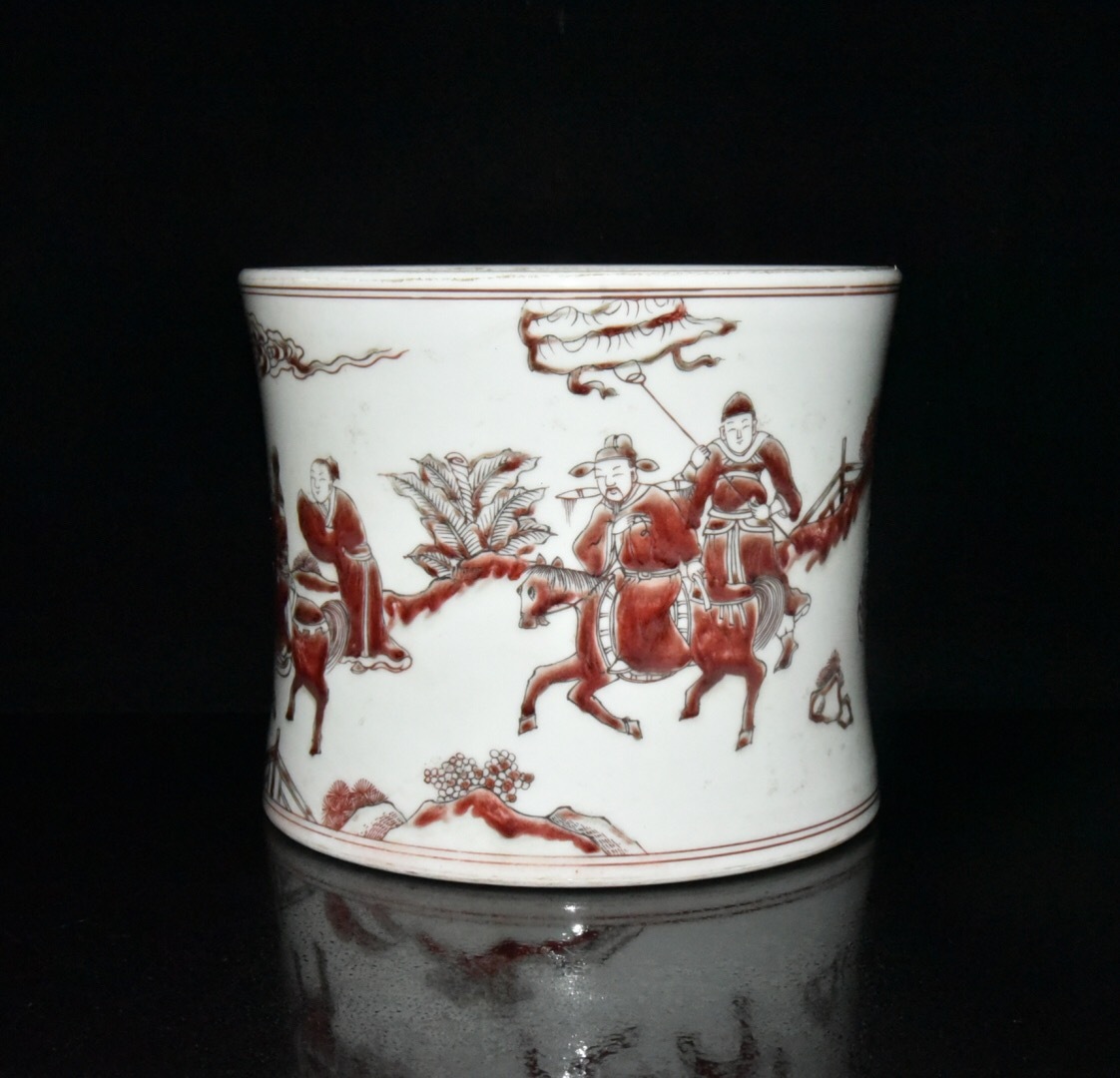 - ▽鴻▽ 清 康熙年製款 釉里紅 人物故事紋 筆筒 古陶瓷品 置物 古賞物 中国古玩 中国古美術