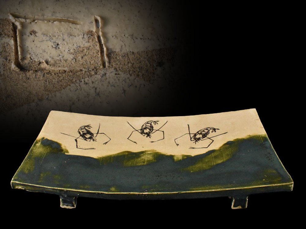 - 本物保証 織部 緑釉 海老絵付俎板皿 28.5×48×5.5cm 本物返品OK 250419−16