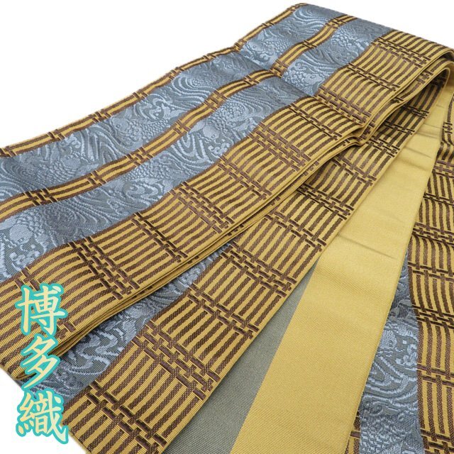 > 半幅帯 未使用 正絹 カジュアル 未仕立て 全通 博多織 ラベル付き 荒磯文 黄土色 青鈍色 多色 きもの北條 A1181-23