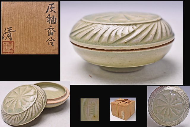 - 原清 ★ 灰釉 香合 ★ 共箱 ★ 人間国宝 ★ 師: 石黒宗麿 / 清水卯一 ★ 中国古陶磁を思わせる美しい逸品 ★ 香道具 ★