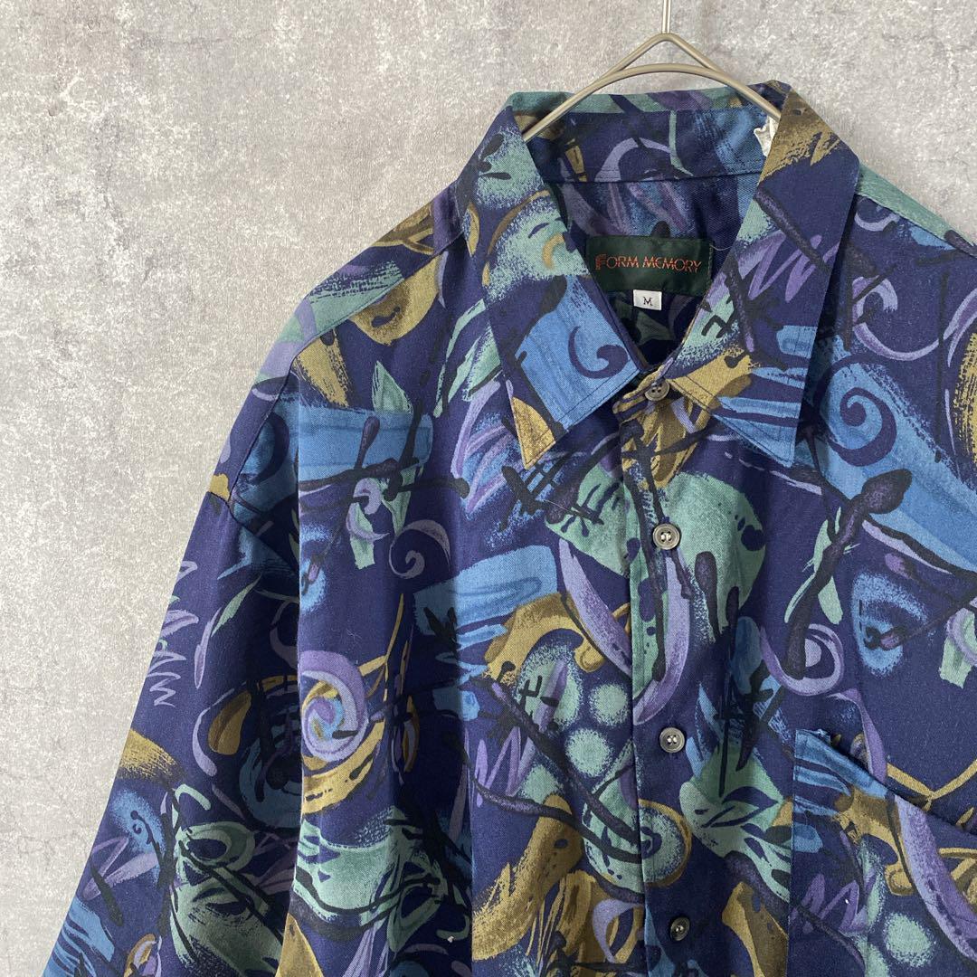 - アート風デザイン 長袖シャツ 柄シャツ 長袖 レーヨンポリ ゆったりMメンズ