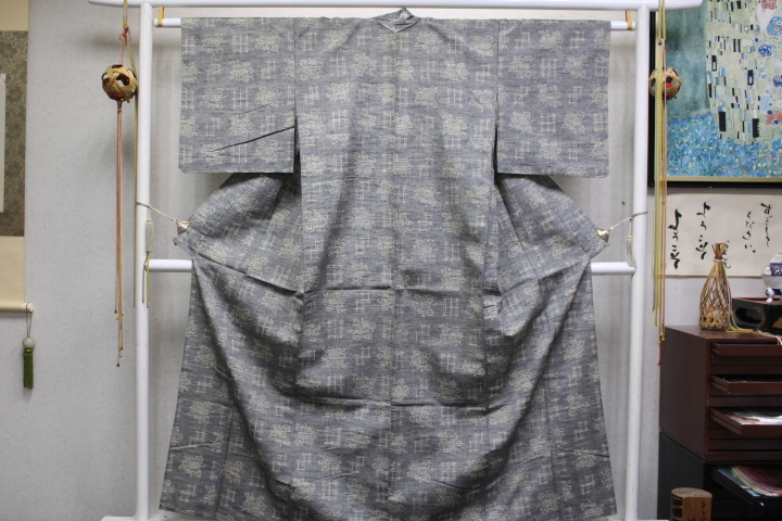 > きもの今昔8428 単衣のきもの バチ衿セブセ付き単衣仕立きもの 正絹紬絣柄 グレー地に花と井絣 身丈159cm
